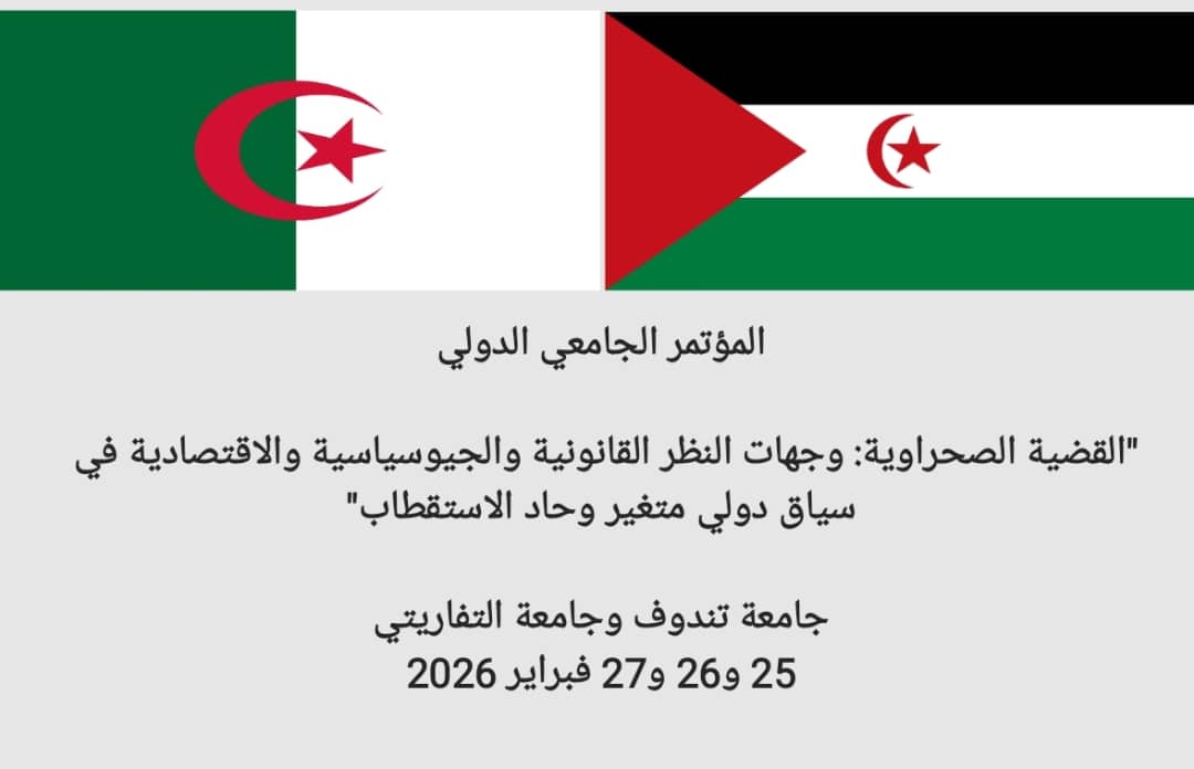 وفي هذا السياق، يأتي المؤتمر الجامعي الدولي “القضية الصحراوية: وجهات نظر قانونية وجيوسياسية واقتصادية في سياق دولي متغير وحاد الاستقطاب”، الذي تنظمه جامعة تندوف (الجزائر) وجامعة التفاريتي (الجمهورية العربية الصحراوية الديمقراطية)، والذي سيعقد أيام 25 و26 و27 فبراير 2026 في الجامعتين، ويتزامن مع الذكرى الخمسين لإعلان الجمهورية العربية الصحراوية الديمقراطية، و يعد هذا المؤتمر مساحة للتلاقي والتفكير والحوار متعدد التخصصات والتضامن مع الشعب الصحراوي.