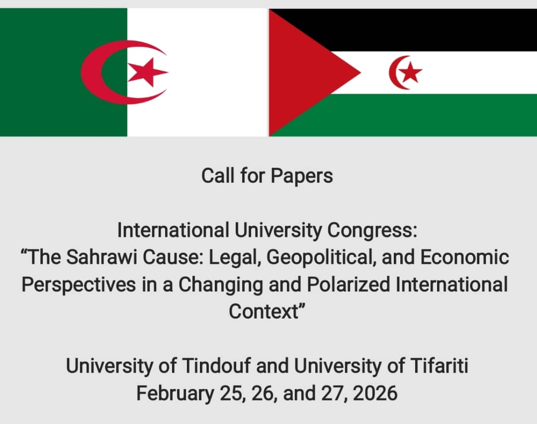 In this context, the International University Congress, “The Sahrawi Cause: Legal, Geopolitical, and Economic Perspectives in a Changing and Polarized International Context”, jointly organized by the University of Tindouf (Algeria) and the University of Tifariti (Sahrawi Arab Democratic Republic), to be held on February 25, 26, and 27, 2026, at both universities’ campuses, and coinciding with the 50th Anniversary of the Proclamation of the SADR, is conceived as a space for encounter, reflection, interdisciplinary dialogue, and solidarity with the Sahrawi people.